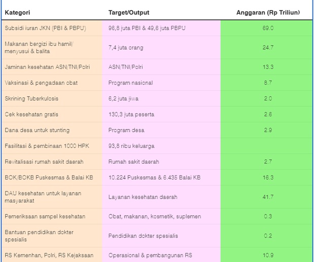 Dari total alokasi Rp244 triliun, pemerintah menyiapkan Rp123,2 triliun khusus untuk layanan kesehatan masyarakat. Porsi terbesar dialokasikan kepada subsidi iuran Jaminan Kesehatan Nasional (JKN) dengan total anggaran Rp69 triliun. Dana ini ditujukan untuk 96,8 juta penerima bantuan iuran (PBI) serta 49,6 juta peserta bukan penerima upah (PBPU) kelas 3.